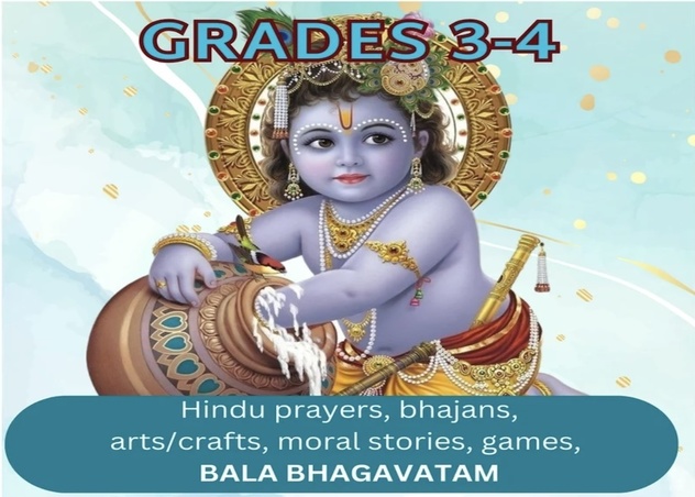 Values imparted through stories from our great Hindu scriptures, quizzes, games, crafts, discussions, bhajans, hymns, shlokas, plays, dances, and cultural festival celebrations in ENGLISH (BALA BHAGAVATAM).